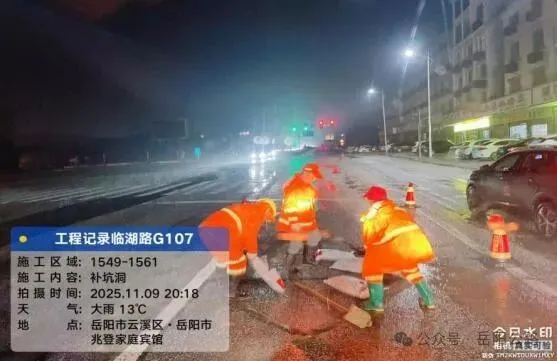 “群众利益无小事,一枝一叶总关情。”11月9日周日晚7点40分,岳阳市公路建设和养护中心接到12345热线“107国道云溪工业园门前有坑槽”紧急工单。尽管大雨滂沱、气温骤降,责任单位107国道养护中心坚持“雨天不降温、服务不打折”,立即启动应急预案,皇姑塘养护部5名“公路橙”5分钟内集结到位,调派车辆、冷再生补路设备,冒雨完成云溪工业园红绿灯处坑槽修补,并第一时间向市民反馈处置结果,用速度诠释温度。从接报到完成修复及回复市民,全程用时仅47分钟。