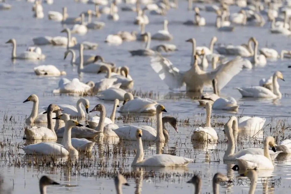 这片湿地的蓬勃生机,在最新监测数据中得到印证:自11月中旬以来,东古湖及周边区域,已迎来了包括小天鹅、豆雁、灰鹤、白鹤、斑嘴鸭等在内的57种珍稀鸟类,总数突破四万羽!万羽翔集,和鸣声声,宣告着一场盛大的冬季嘉年华正在东古湖渐入高潮。尤为瞩目的是,作为“先头部队”的小天鹅,其种群规模仍在持续壮大,当之无愧地成为这场嘉年华中最耀眼的明星。