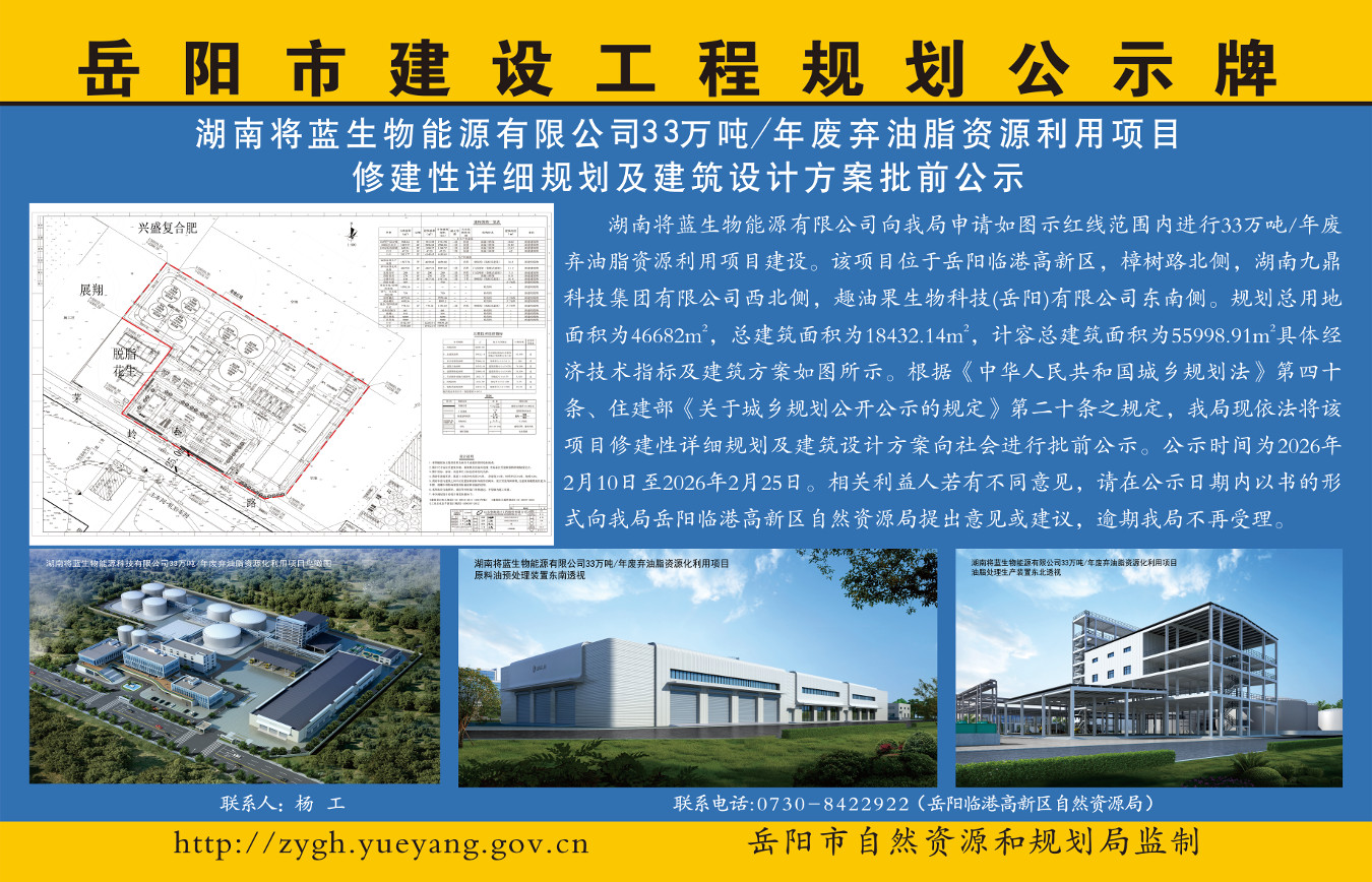 湖南将蓝生物能源有限公司33万吨年废弃油脂资源利用项目修建性详细规划及建筑设计方案批前公示