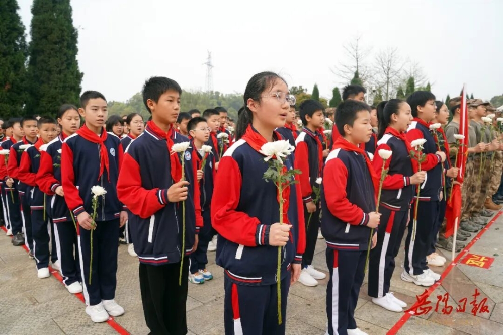 岳阳市烈士陵园现场庄严肃穆。9时整,仪式开始,全场齐声高唱中华人民共和国国歌。国歌唱毕,全场肃立,向烈士默哀。默哀毕,东方红小学少先队员们献唱《我们是共产主义接班人》。