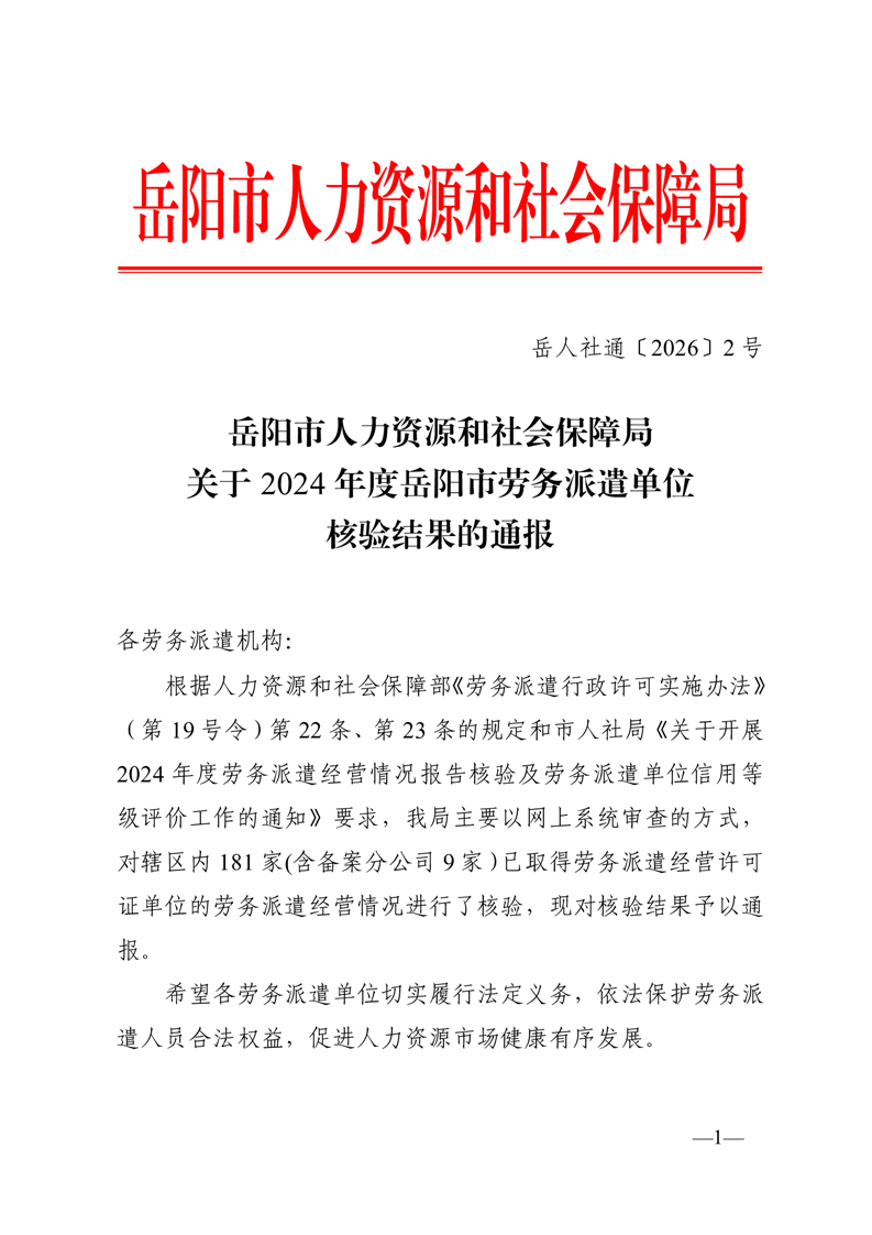 关于2024年度岳阳市劳务派遣单位核验结果的通报