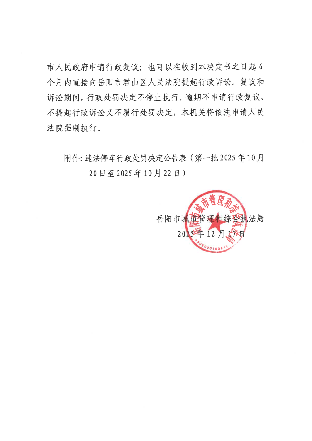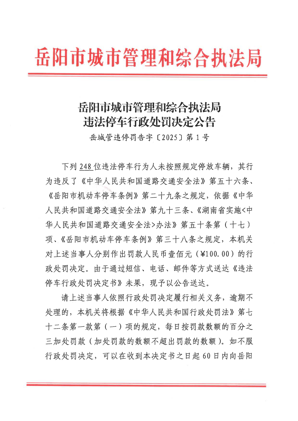 岳阳市城市管理和综合执法局违法停车行政处罚决定公告(岳城管违停罚告字[2025]第1号)