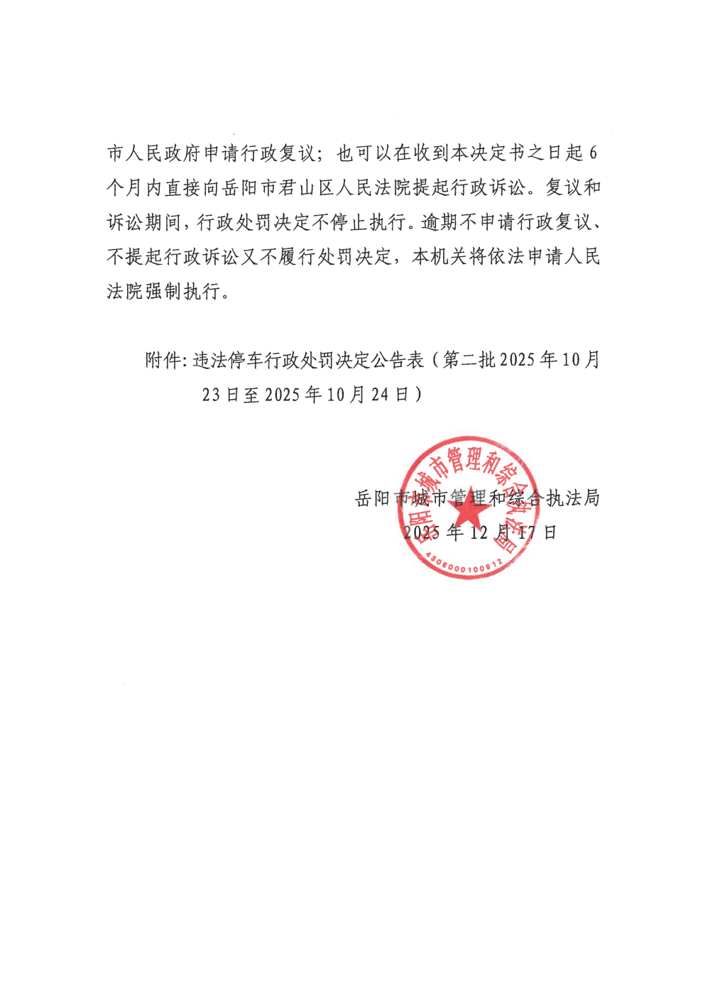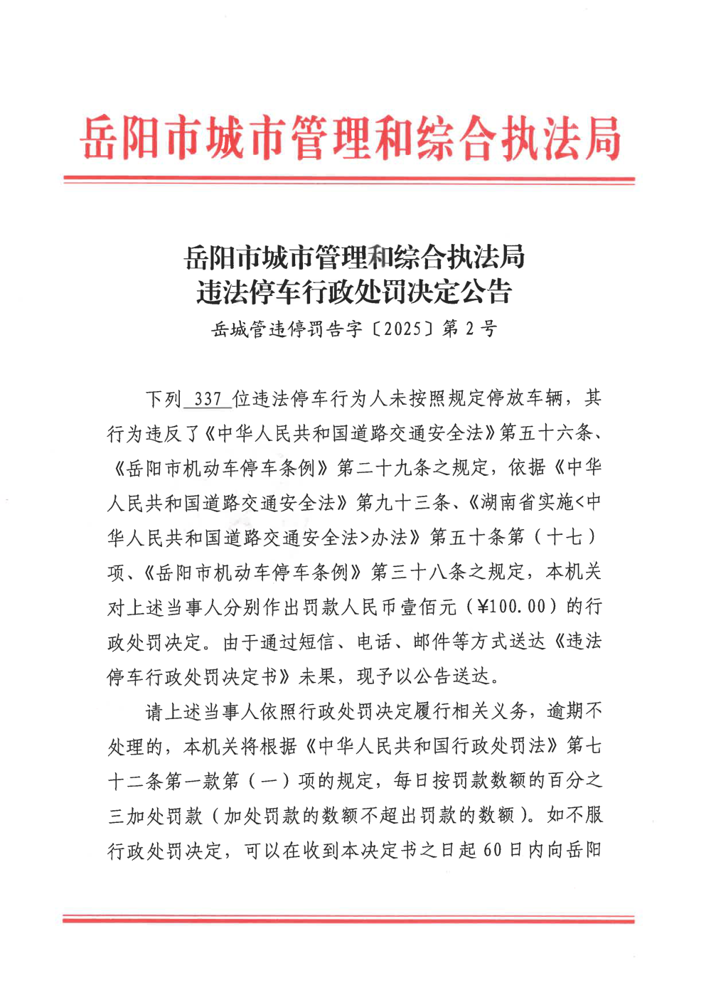岳阳市城市管理和综合执法局违法停车行政处罚决定公告(岳城管违停罚告字[2025]第2号)