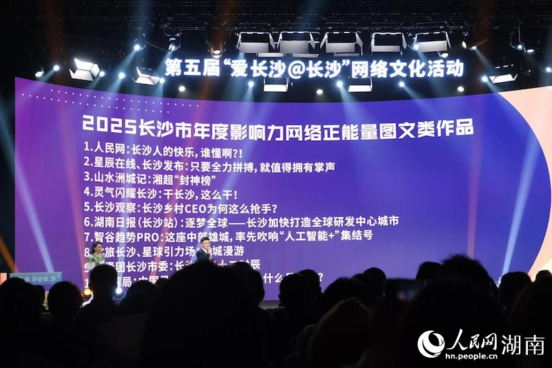 人民网长沙1月31日电 (记者匡滢、向宇)1月30日,“来长沙 一起干”第五届“爱长沙@长沙”网络文化活动举行,现场集中展示2025年长沙网络文化和网络文明建设工作成果。其中,人民网《长沙人的快乐,谁懂啊?!》获评2025长沙市年度影响力网络正能量图文类作品。